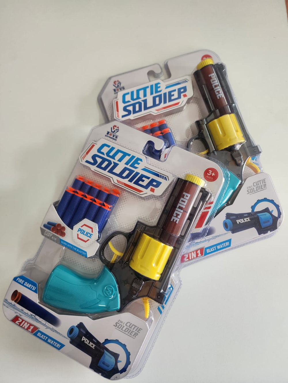 The product is a novelty "2 in 1" toy gun designed for dual use as a foam dart blaster and a water squirter, marketed under the unique "Cutie Soldier" brand.