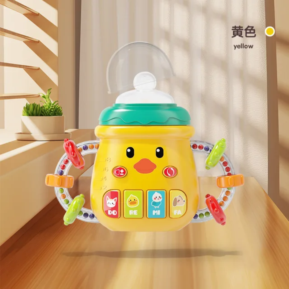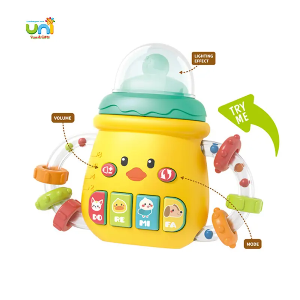 A colorful, musical toy shaped like a baby bottle, designed for infants and toddlers (18+ months) to stimulate auditory and visual development.