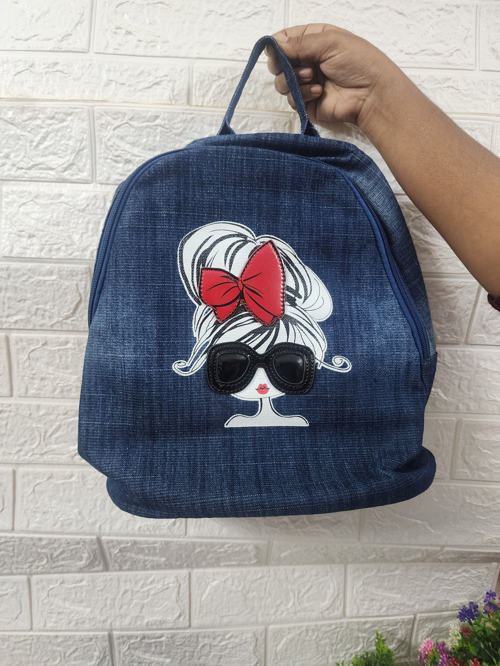 Handle: It features a simple denim loop handle at the top for hanging or carrying by hand (shoulder straps are not visible but assumed for a backpack).