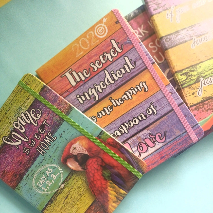 Brighten your day with the ColorSplash Quote Mini Notebook Collection! These vibrant mini notebooks feature colorful wood-texture backgrounds, motivational quotes, and eye-catching designs like tropical parrots and cheerful messages. Each notebook comes with a matching elastic band to keep your notes safe and organized. Perfect for jotting down ideas, daily reminders, doodles, or journaling on the go