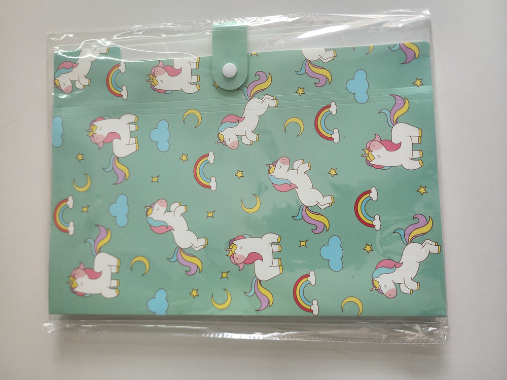 Design Theme: The entire surface is covered with a highly decorated, whimsical, cartoon-style print. The dominant theme is a unicorn, which is also explicitly written vertically on the design.