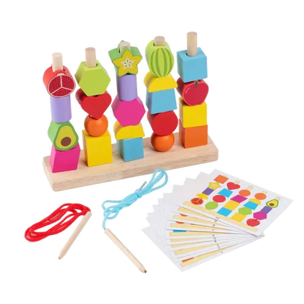 Combined Function: The toy serves as both a stacking toy and a lacing toy. Children can stack the shapes on the dowels by matching the shape of the hole to the shape of the dowel, or they can use the laces to string the shapes together.