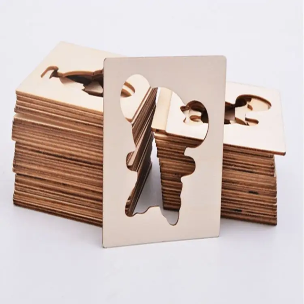 A stack of wooden stencil or puzzle pieces with cutout shapes (an animal shape, possibly a dog or horse, is visible on the top piece).