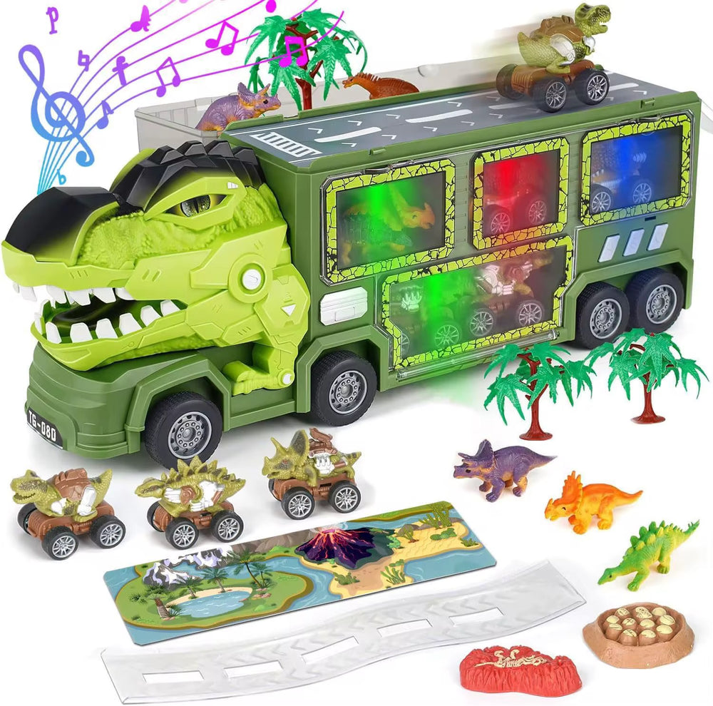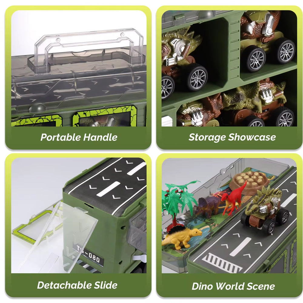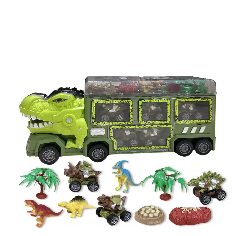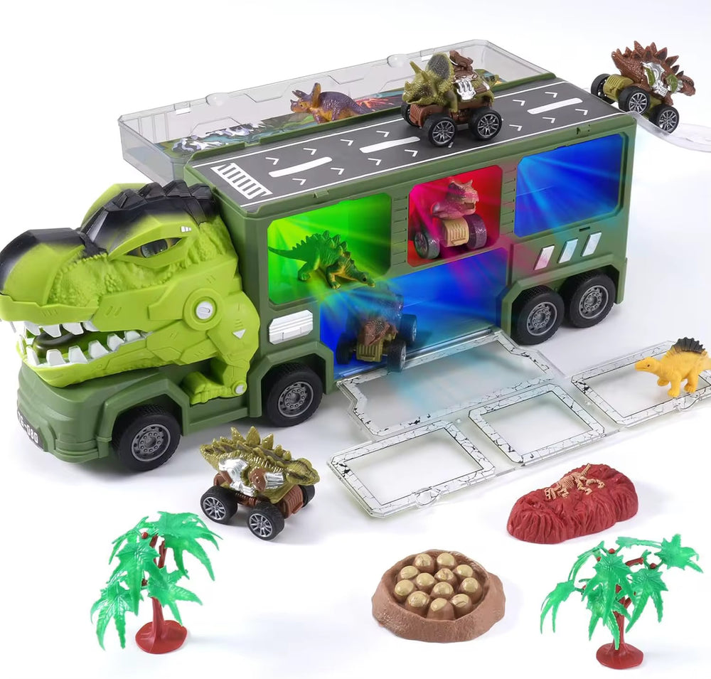 Bring home the excitement of the Jurassic world with this action-packed dinosaur carrier truck! Designed with a fierce dinosaur head in the front, this truck doubles as a storage case and a play arena. It comes with multiple dinosaur cars, mini dinosaur figures, trees, and accessories to spark endless imaginative play. Kids can load the dino cars inside the truck, launch them from the side doors, and create their own adventurous dino land. Perfect for little explorers who love vehicles and dinosaurs, this playset offers fun, creativity, and learning all in one!
