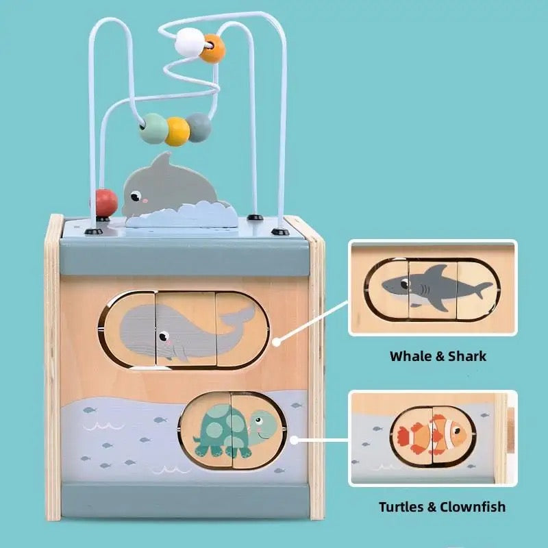 The Ocean 5 in 1 Activity Cube provides endless educational and developmental opportunities for young minds. With its five different activities, including shape sorting, puzzles, and animal recognition, this cube promotes cognitive and motor skills while fostering creativity and exploration. Durable and compact, it's perfect for on-the-go learning.