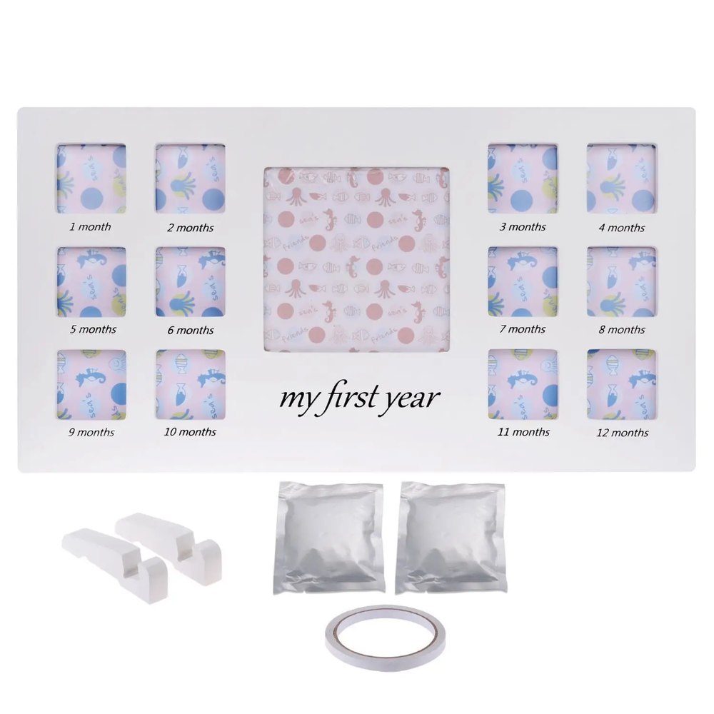 This is a white, desktop-style photo frame designed to commemorate a baby's first year.