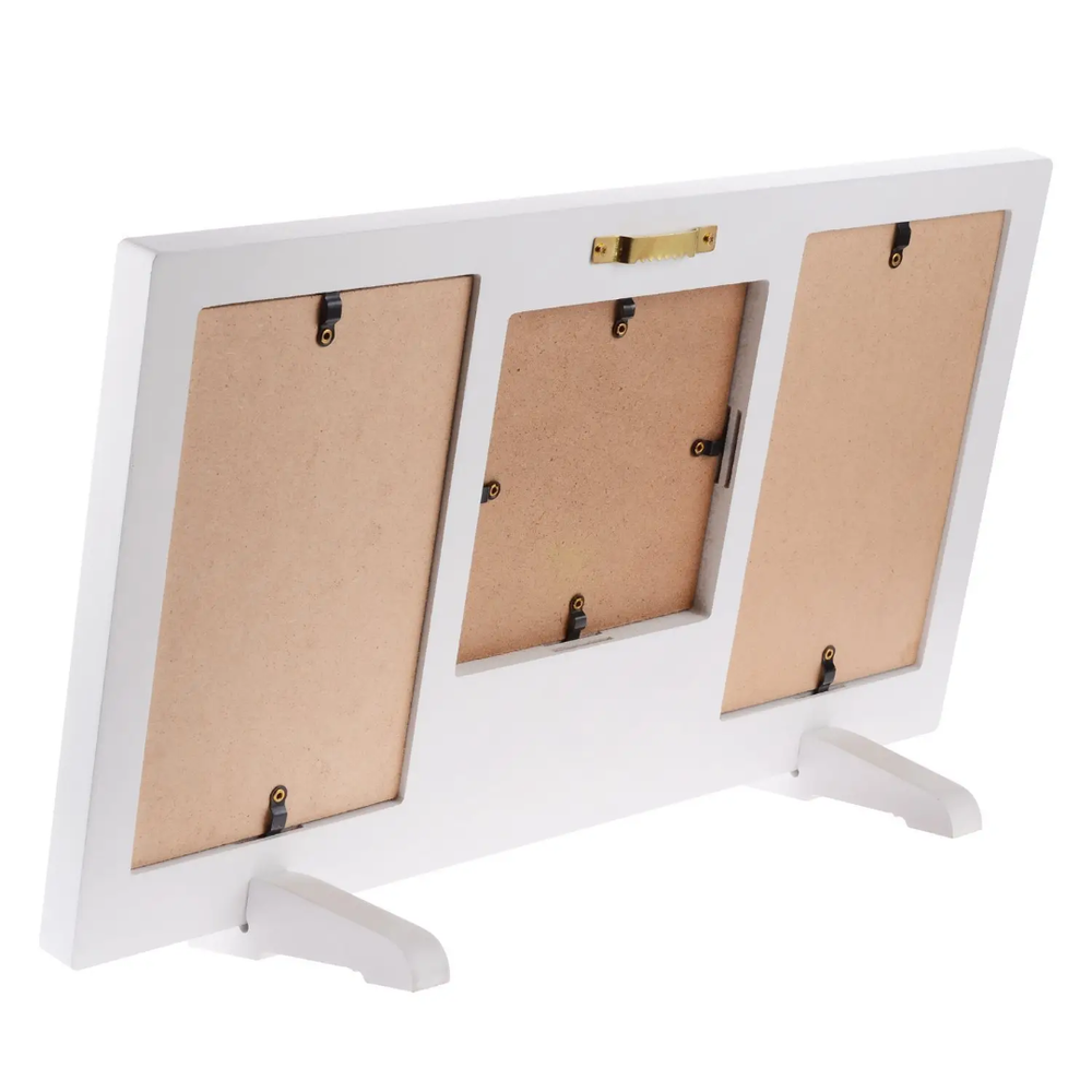 Display: The frame is designed to stand upright using two small, white detachable stands attached at the bottom.