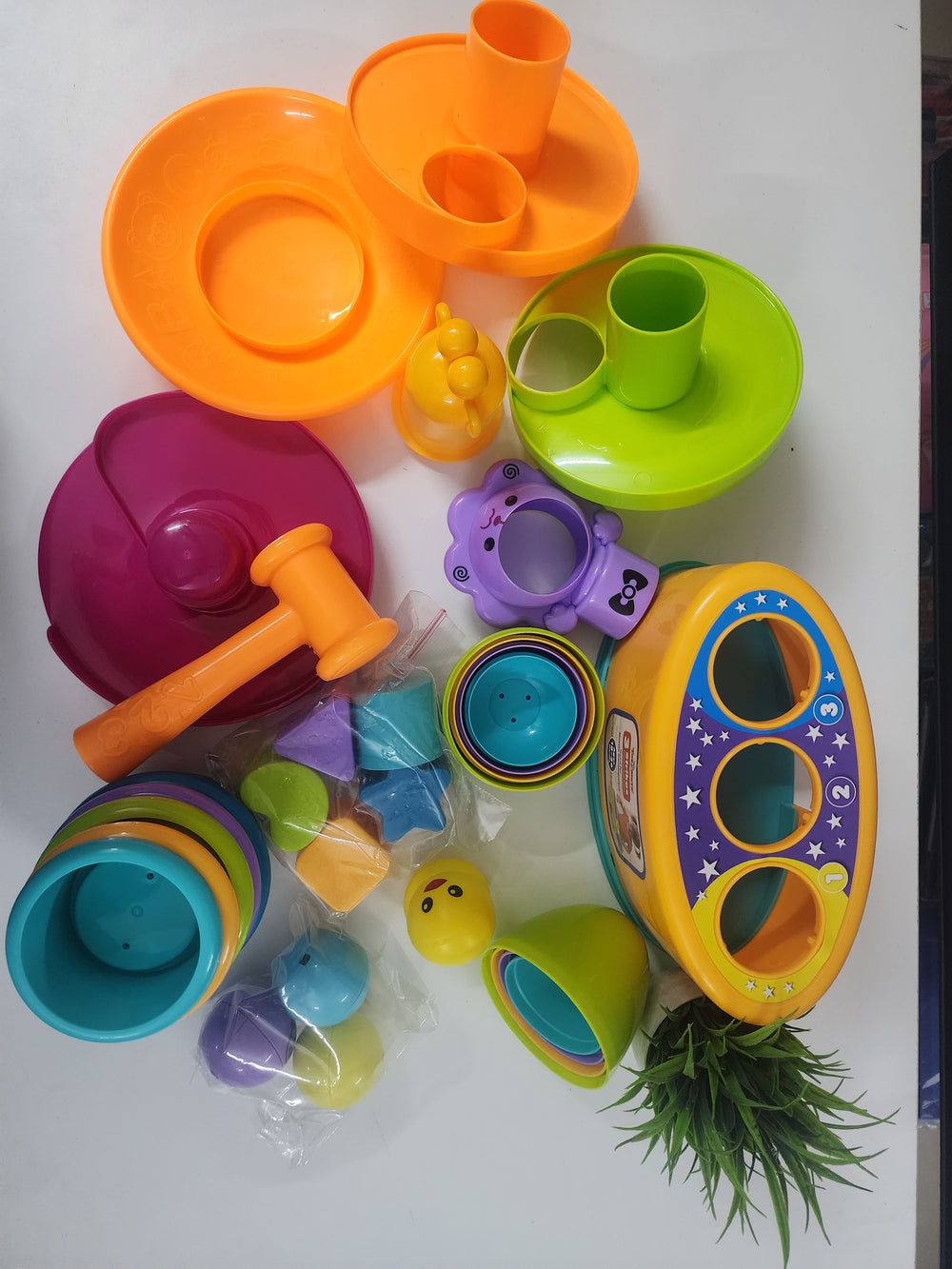 Stacking Rings/Cups: At least two different styles of colorful stacking toys are visible, with cups featuring animal pictures (elephant, duck, car, etc.) and a giraffe-themed stacker with various animal heads/faces (bear, lion, panda, elephant).
