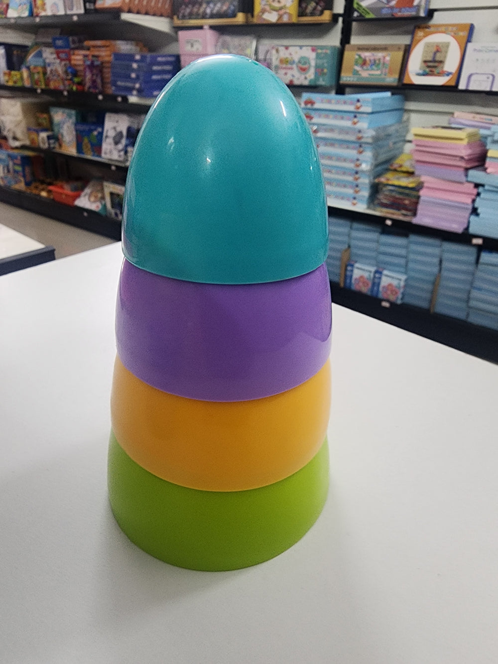 Nesting Eggs: Three colorful, numbered, or animal-themed eggs (one with a small chick toy inside), indicating a nesting or sorting activity.