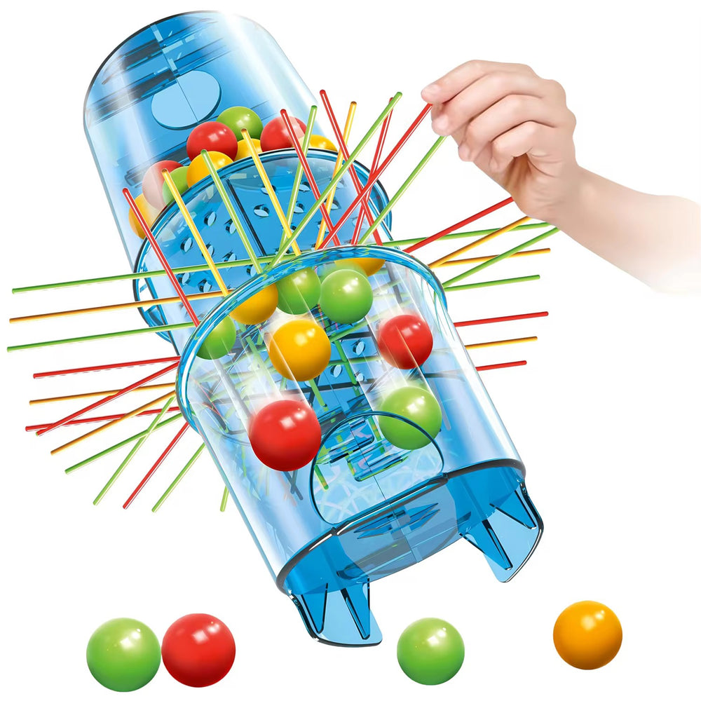 Insert all sticks, drop in the balls, and take turns removing sticks one by one. The player with the fewest fallen balls wins!