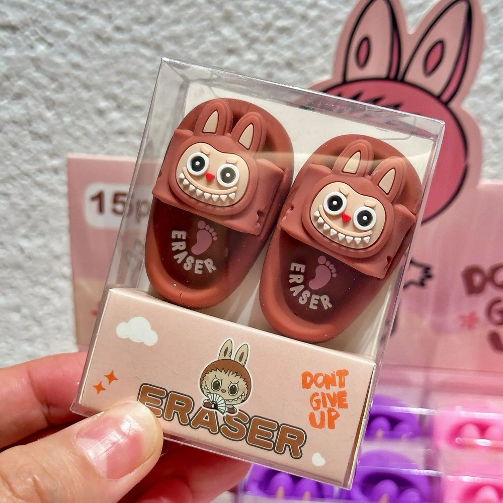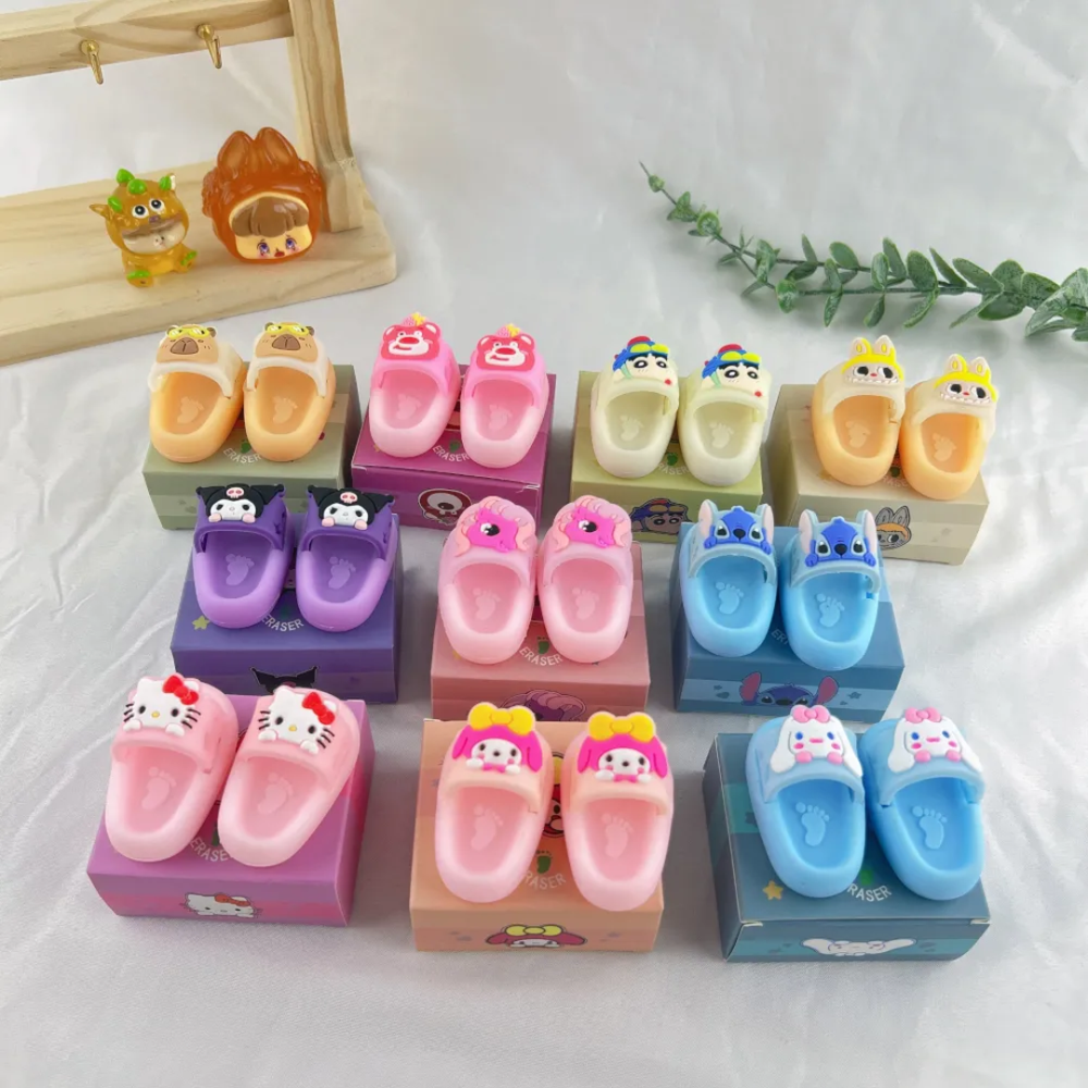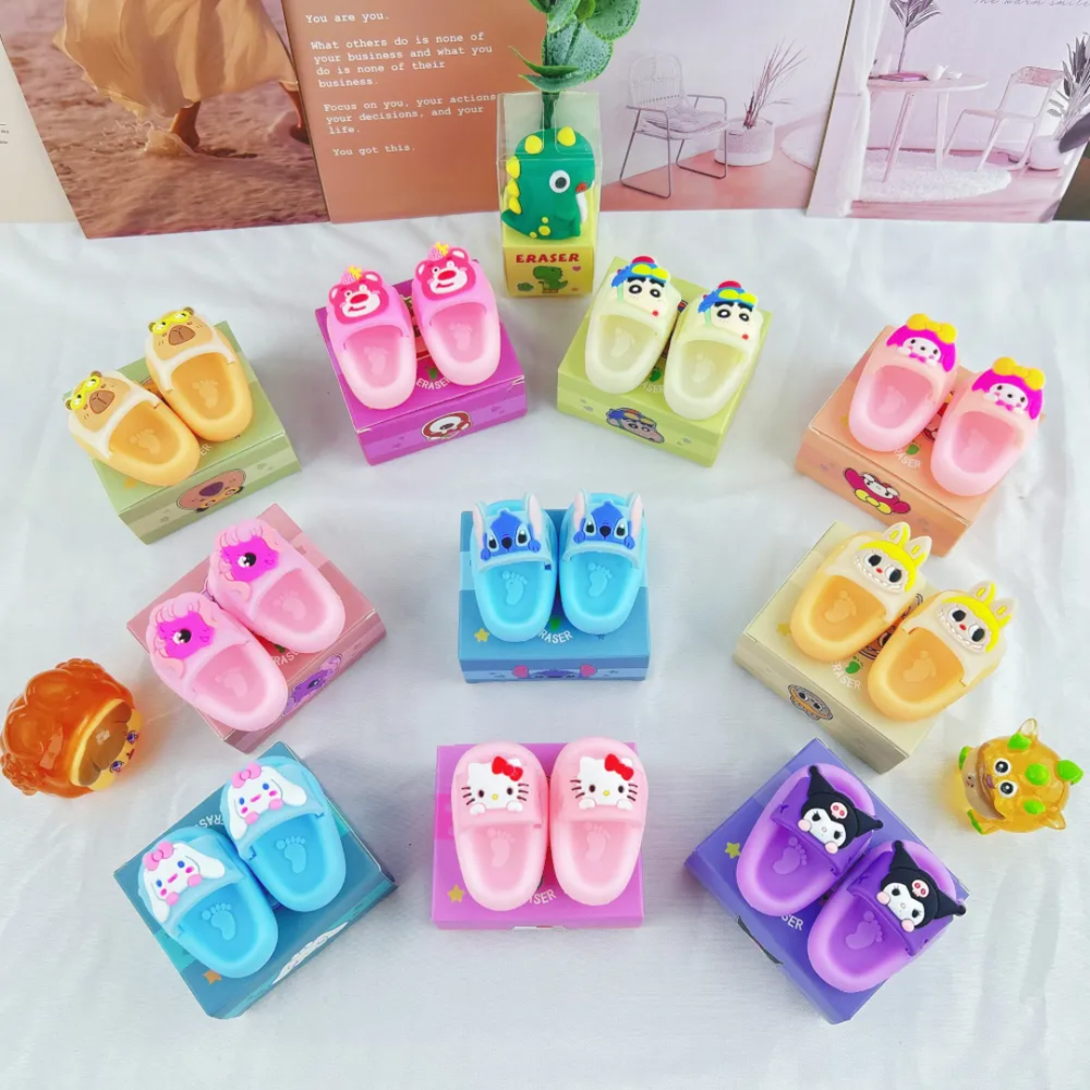 The image displays a collection of novelty erasers that are shaped like miniature slippers, often referred to as "slipper erasers". These items are designed to add a fun and playful touch to a stationery collection.