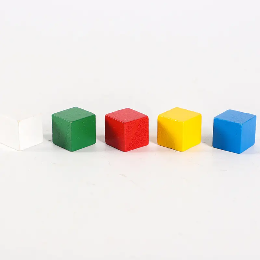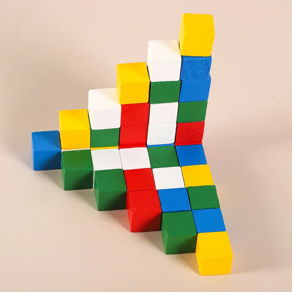 Materials and Form: It's composed of numerous small, uniformly sized wooden blocks (cubes) that are painted in bright, primary, and secondary colors.