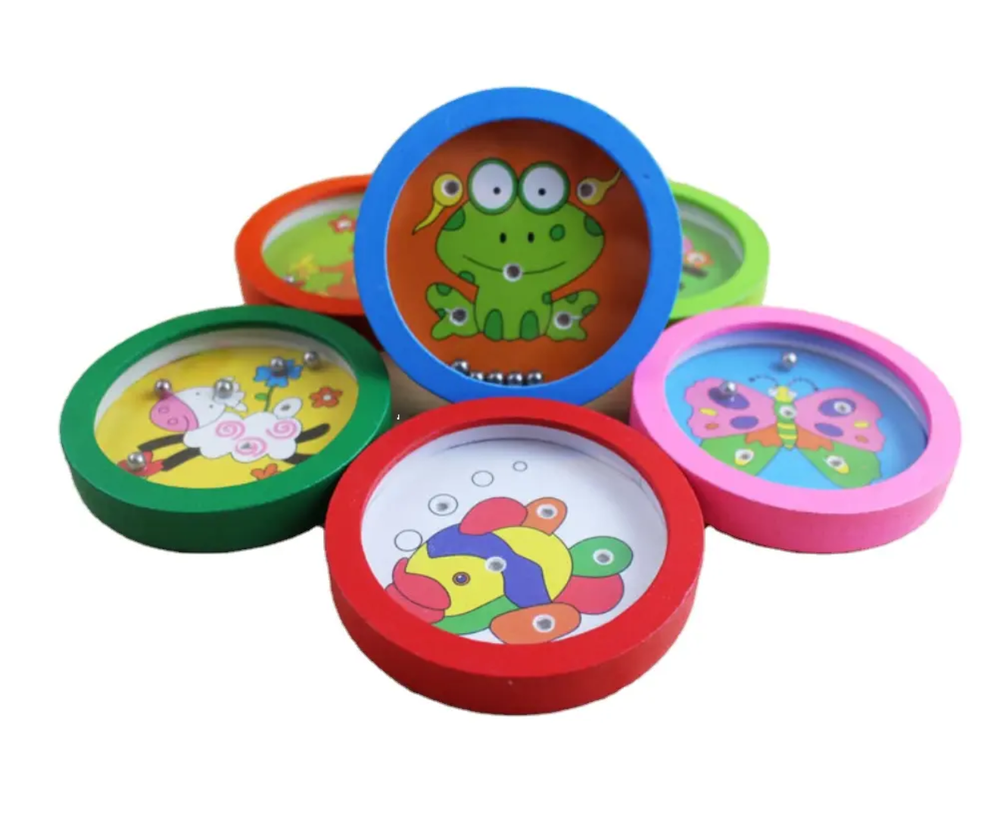 A collection of small, circular, handheld dexterity puzzles, featuring colorful wooden or plastic frames and a clear plastic cover over a printed maze.